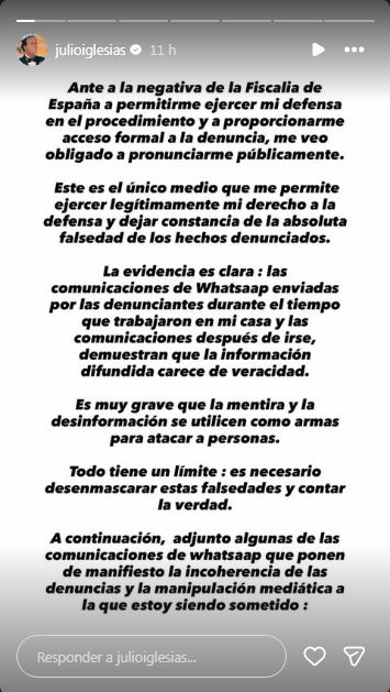 Dice que Instagram es el “único medio que me permite ejercer legítimamente mi derecho a la defensa y dejar constancia de la absoluta falsedad de los hechos denunciados”, después de que la Fiscalía española no le permitiera ejercer su defensa en el procedimiento que se ha iniciado en este país.