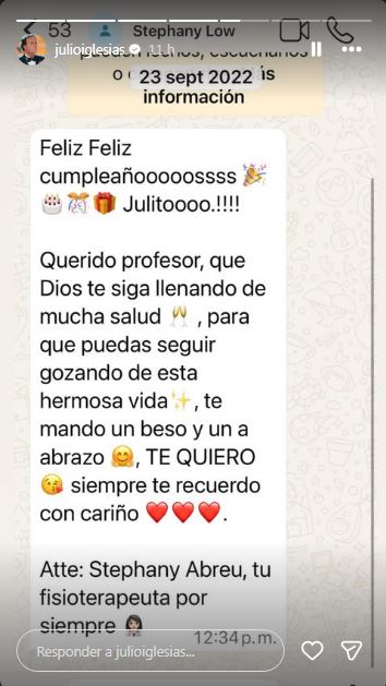 En uno más del 23 de septiembre de 2022, le desean “Feliz cumpleañooooosss Julitoooo!!! Querido profesor, que Dios te siga llenando de mucha salud para que puedas seguir gozando de esta hermosa vida, te mando un beso y un abrazo, TE QUIERO. siempre te recuerdo, con cariño”.